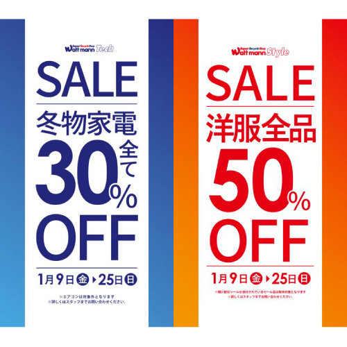 ワットマンでは1月25日(日)まで洋服全品50%OFF!冬物家電全て30%OFF!
